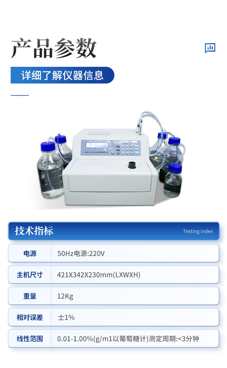 電源:50Hz電源:220V主機尺寸:421X342X230mm(LXWXH)重量:12Kg相對誤差:士1%線性范圍:0.01-1.00%(g/m1以葡萄糖計)測定周期:<3分鐘