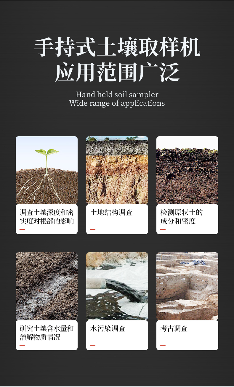 旋轉(zhuǎn)式,上下沒有擾動,不會破壞土壤剖面結(jié)構(gòu) 采樣量大,插銷連接,易于拆卸。 鉆頭帶有鋸齒,通過沖擊錘鉆入土壤,入土容易。 筒型鉆頭獨特可拆卸裁口設(shè)計,取樣容易。 樣品處于比較寬松的柱狀圓筒中,取出十分容易 狀土壤很難被壓縮(保持原狀) 采集一個樣本就可以研究整個土壤剖面情況 比開挖一個采樣坑要節(jié)約時間和減少樣本破壞 可有效地用于所有類型的土壤