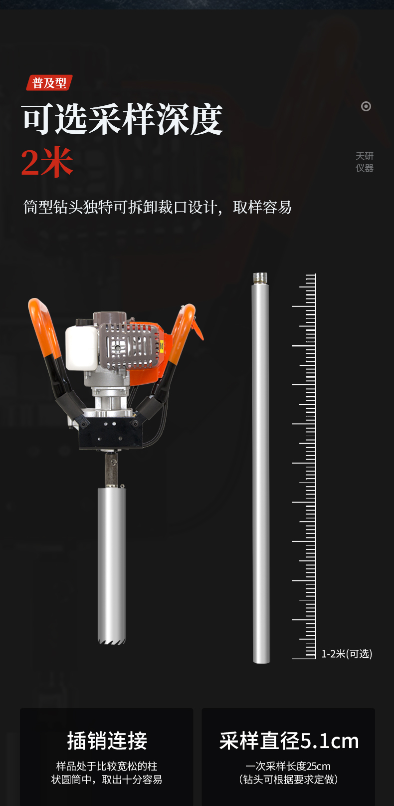 規(guī)  格: 采樣直徑5.1cm、一次采樣長度25cm(鉆頭可根據(jù)要求定做) 采樣深度:2米,延長桿插銷連接。 發(fā)動機形式:風冷單缸二沖程 發(fā)動機排量:52CC 發(fā)動機功率:1.9kw/7000r/min 齒輪箱配置:采用齒輪二級變速,軸承轉(zhuǎn)動 傳動方式:齒輪變速傳動 啟動方式:手拉反沖起動 燃油比:93號汽油與二沖程機油25:1 燃油箱容積:1200ml 凈 重:20kg