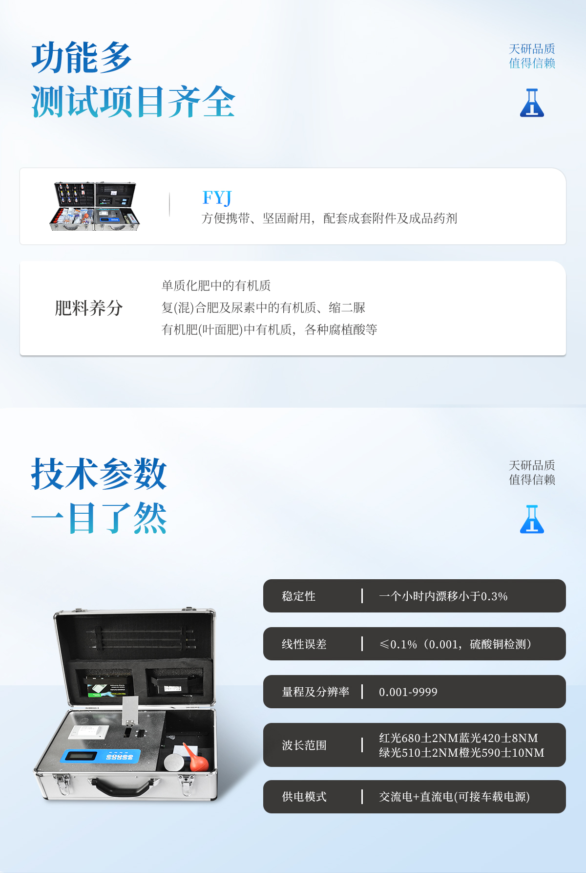 | 肥料養(yǎng)分專用檢測儀功能全:測試項目國內(nèi)外*全(各類藥劑均可選購)。 | 配套齊全,該儀器集藥、器、儀為一體,攜帶方便,相當(dāng)于一個小型實驗室,用戶只需提供蒸餾水即可在要求時間內(nèi)完成全部操作。適于農(nóng)業(yè)服務(wù)部門或農(nóng)資經(jīng)銷商鑒別肥料真假、肥料廠商肥料生產(chǎn)中控、農(nóng)資質(zhì)檢部門進(jìn)行農(nóng)資打假,規(guī)范農(nóng)資市場。 | 性能可靠:工作穩(wěn)定性優(yōu)于國家標(biāo)準(zhǔn)JJG179-90指標(biāo)的10倍以上,重復(fù)性達(dá)到光柵型分光光度計指標(biāo)水平。 |